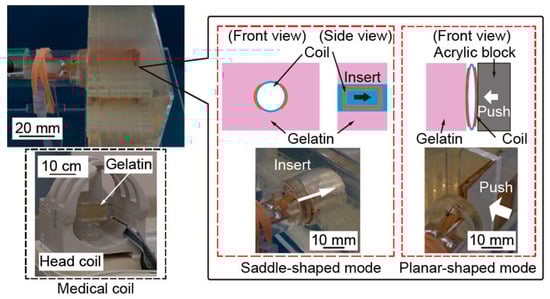 Schematic of the gelatin placement. The micro saddle coil was inserted into the gelatin in saddle-shaped mode, and pushed against the gelatin in planar-shaped mode. The medical head coil is evaluated for comparison.