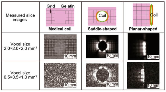 As shown in Figure 10, the visible area of the medical head coil at the voxel size of 2.0 × 2.0 × 2.0 mm3 is 37,268 mm2. Although the obtained MRI image is slightly blurred, most of gelatin area can be visualized by the medical head coil. At the voxel size of 0.5 × 0.5 × 1.0 mm3, we cannot observe the gelatin and grid from the MRI image taken with the medical head coil. On the other hand, we can observe the gelatin and grid from the MRI image of the micro saddle coil in two modes not only at the voxel size of 2.0 × 2.0 × 2.0 mm3 but also at the voxel size of 0.5 × 0.5 × 1.0 mm3. The visible area of the saddle-shaped and planar-shaped modes are 987.5 mm2 and 320.3 mm2 at the voxel size of 0.5 × 0.5 × 1.0 mm3. Therefore, we confirm that the micro saddle coil is capable for measuring the MRI images at the voxel size that has been difficult for the medical head coil.