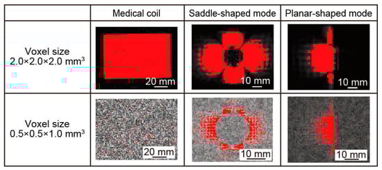 To evaluate the MRI images quantitatively, we used the image analysis software to calculate the visible area. The measured MRI images were converted to the images with 256 stage of brightness. We used the four corners of the converted image as a noise area. The visible area at voxel size of 2.0 × 2.0 × 2.0 mm3 was defined as the area with more than 8 times the brightness of the noise area. The visible area at voxel size of 0.5 × 0.5 × 1.0 mm3 was defined as the area with more than 3 times the brightness of the noise area. As shown in Figure 10, the red area is the visible area of the MRI image. At this time, the sizes of 1 pixel are 2.0 × 2.0 mm2 and 0.5 × 0.5 mm2 at the voxel size of 2.0 × 2.0 × 2.0 mm3 and 0.5 × 0.5 × 1.0 mm3, respectively. We counted the red pixels of each image and calculated the visible area of the MRI images. Table 3 shows the size of the visible area. In the voxel size of 2.0 × 2.0 × 2.0 mm3, the visible area of the medical head coil, the saddle-shaped mode, and the planar-shaped mode were 37,268, 5188, and 1196 mm2, respectively. In the voxel size of 0.5 × 0.5 × 1.0 mm3, the visible area of the medical head coil, the saddle-shaped mode, and the planar-shaped mode were 41.5, 987.5, and 320.3 mm2, respectively. We can indicate the visible area in each image quantitatively.