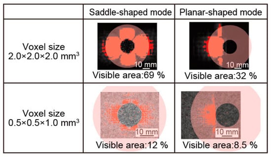 Finally, we evaluated the micro saddle coil using the ratio of the visible area to the cross-sectional area of the esophagus. We defined the hollow cylinder with the diameter of 60 mm as the cross-sectional area of the esophagus. Figure 11 shows the comparison results of the visible area to the cross-sectional area of esophagus. The ratio of the visible area of the saddle-shaped and the planar-shaped modes were 68% and 32% at the voxel size of 2.0 × 2.0 × 2.0 mm3, respectively. The ratio of the visible area of the saddle-shaped and the planar-shaped modes were 12% and 8.5% at the voxel size of 0.5 × 0.5 × 1.0 mm3.