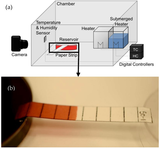 Experiments were conducted in a temperature and humidity controlled chamber measuring 51.5 cm × 41.5 cm × 41 cm, as shown in Figure 1a. The temperature in the chamber was adjusted using a 250 W heat lamp, measured using a digital thermometer, and controlled using a digital temperature controller (TC). The humidity in the chamber was established using a submerged heater in an open container of water, monitored using a digital hygrometer, and controlled using a digital humidity controller (HC). The heater and submerged heater were placed on the right side of the chamber, while the reservoir and sensors were placed on the left side of the chamber, approximately 25 cm away from the heaters. The reservoir was placed 3 cm away from the left wall of the chamber, and the sensors were mounted on the left wall of the chamber, no higher than 10 cm above the reservoir and paper strip, to ensure that the temperature and humidity readings monitored the reservoir and paper strip conditions as accurately as possible. There was no active mixing of the air in the chamber in order to avoid convection, and after changes in conditions the chamber was allowed to reach equilibrium prior to conducting experiments.