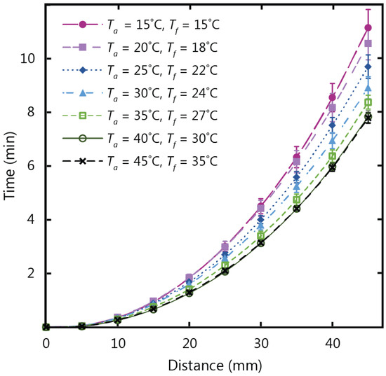 Figure 2 shows the experimental results for fluid flow in paper strips with a 10 mm width and a 45 mm length, tested in temperature conditions ranging from 15 to 45 °C at a fixed relative humidity of 30%. After analyzing the data from the experiments, it was clear that the temperature of the fluid in the reservoir (Tf) was what influenced the wicking behaviour rather than the air temperature (Ta). It can be observed in Figure 2 that the flow profiles follow the typical Washburn behaviour and the distance travelled by the fluid front is proportional to the square root of time [35]: