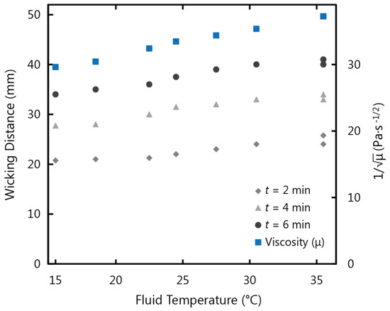 where is distance, is the surface tension, is the contact angle, is viscosity of the fluid, is the average pore radius, and is the time. It can also be observed that the total wicking time decreased as temperature increased. In conditions of 15 °C fluid and air temperature, a wicking time of approximately 11 min was required for the fluid front to travel a distance of 45 mm. With a fluid temperature of 35 °C (air temperature of 45 °C), wicking time was reduced by three minutes, and a total duration of approximately 8 min was required for the fluid front to travel 45 mm in the paper strip. These results demonstrate that the time required for the fluid front to travel the length of the paper strip decreases as temperature increases, and correspondingly speed increases. This increase in wicking speed can be attributed to the decrease in the viscosity of water as its temperature increases. To analyze this justification, Figure 3 shows a comparison of the experimental results for wicking distance at 2, 4, and 6 min versus the inverse root of viscosity at varying fluid temperatures. This correlation between wicking distance and viscosity follows the Washburn model Equation (1), where the wicking distance is inversely proportional to the root of viscosity. The corresponding dependence of wicking distance and the viscosity term on temperature shown in Figure 3 confirms that the fluid viscosity accounts for the observed variations with temperature.