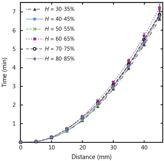 Wicking in paper strips with the same dimensions as the temperature tests (10 mm width and 45 mm length) were tested in humidity conditions ranging from 30% to 85% relative humidity (H), at a fixed air temperature of 20 °C, and the experimental results are shown in Figure 4. Despite the variations in humidity, the wicking time for the fluid to fill the full length of the paper strip had a consistent value of approximately 7 min. There was no observable increase or decrease in wicking velocity beyond the experimental error that corresponded to increases in humidity for the conditions of our experiment. This result indicates that µPADs developed for applications fed from large fluid reservoirs and settings with varying humidity levels can yield consistent flow behaviour regardless of fluctuating levels of humidity.