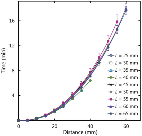 Experimental results for wicking in 1 CHR strips of lengths (L) varying from 25 to 65 mm, and a width of 10 mm.