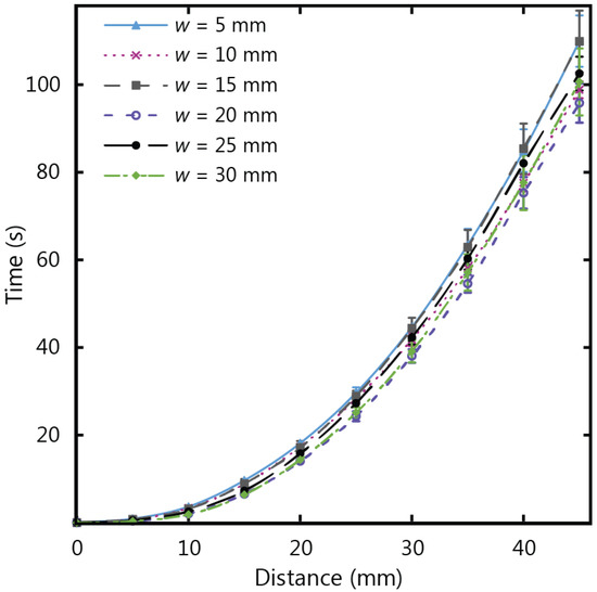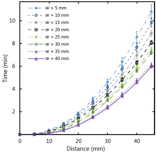 Experimental results for wicking in 1 CHR strips of widths (w) varying from 5 to 40 mm, and a length of 45 mm.