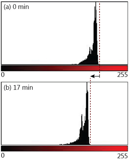 Figure 9 compares the colour intensity of a paper strip at the moment of complete wetting to the colour intensity 17 min after complete wetting. Colour intensity is measured by representing each pixel in the image with a numerical value between 0 and 255, where 0 is the value assigned to the darkest pixels and 255 is assigned to the brightest red pixels. The colour profile shows a shift to the left (lower pixel values) that reflects the darkening in colour due to the increase in dye within the paper strip. The darkening can also be observed in the paper strips in the inset of Figure 10. The overall darkening of the whole paper strip confirms that the amount of dye increased due to post-wetting flow and not due to diffusion, since diffusion would result in a redistribution of the dye rather than an overall increase. To provide further verification of whether the colour change was due to increased flow from the reservoir or the diffusion of dye particles, a fully wetted strip was removed from the reservoir immediately after the fluid front reached the end of the strip and the colour was compared to a strip that remained in the reservoir. A slight redistribution of the dye was detected as the removed strip evened in colour, however, there was no distinct darkening in the colour of this strip. Additionally, the mass of both strips was measured 18 min after wetting. Both strips were kept in the same location to ensure that both would undergo the same amount of evaporation and rule out evaporation as a cause of the change in fluid volume within the strip. The mass of the paper strip that remained in the reservoir was 36% higher than the paper strip that was removed from the reservoir, thus confirming the presence of post-wetting flow.