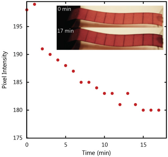 To determine the post-wetting flow behaviour as a function of time we analyzed the colour intensity of the paper strip after wetting was complete. The maximum value for red pixels is the numerical value assigned by the software to the brightest red pixel in the image. This value was measured every minute after saturation, where a lower value represents a darker red colour corresponding to an increase in dye concentration, and these values are plotted in Figure 10. The data demonstrates a decreasing relationship between time and brightness of the red colour in the paper strip that levels off after approximately 15 min. This data indicates that there exists a maximum quantity of water that will fill the paper strip during post-wetting flow.