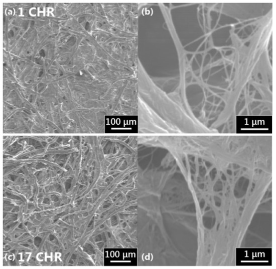 Scanning electron micrographs of cellulose fibre networks in (a) 1 CHR at 100× magnification, (b) 1 CHR at 10,000×, (c) 17 CHR at 100×, and (d) 17 CHR at 10,000×.