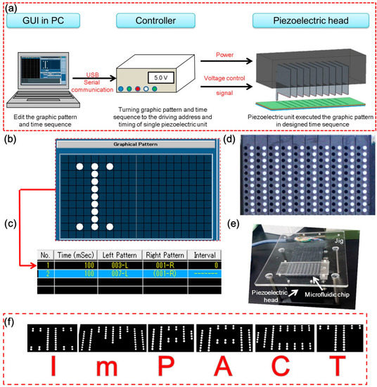 In our previous research, a small number of computer-controlled piezoelectric units customized by the KGS Corporation were used [4]. This time we increased the number of individual piezoelectric units to 110. An actuator system was constructed to control these 110 individual piezoelectric units (Figure 3). This system consisted of three main parts: a PC (with a graphic user interface (GUI) installed), a custom circuit board-based controller (provides power and control signals), and a piezoelectric head containing 110 piezoelectric units (Figure 3a and system flow was shown in Figure S1. We could first design one or numerous graphic patterns to describe the locations and activating time sequence of the valves that we wanted to be opened and those that needed to be closed, as shown in Figure 3b. Here, a white dot indicates the open state for a valve, and the others are closed. Next, we arranged these graphic patterns in a time sequence table to determine the timing using a specific valve pattern (Figure 3c). Each line in the table contains one graphic pattern of the activated valve position, valve operation time interval, and sequence parameters. In Figure 3d, the white pins are piezoelectric units with a diameter of 1 mm, and the pitches of these pins are 4.8 mm (horizontal) and 2.4 mm (vertical). The force generated by each pin was 0.2 N. All 110 pins were used, and all the units had similar response times, forces, and strokes. The position control property of the piezoelectric unit was investigated (Figure S2). The pattern and time sequence were translated into a control signal for the piezoelectric head via a customized circuit-board-based controller. This piezoelectric head (in Figure 3e) can receive commands and power. The word “ImPACT” in Figure 3f is an image captured from a demonstration of the piezoelectric units operated using an alphabet pattern sequence.