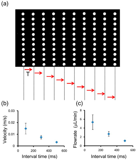 In our previous research, we reported the minimum time interval for a peristaltic pump to be 0.02 s [4]. In this study, we investigated the relations between the channel flow velocity, flow rate, and operation time interval (down to 0.1 s) of the valves (Figure 7a).