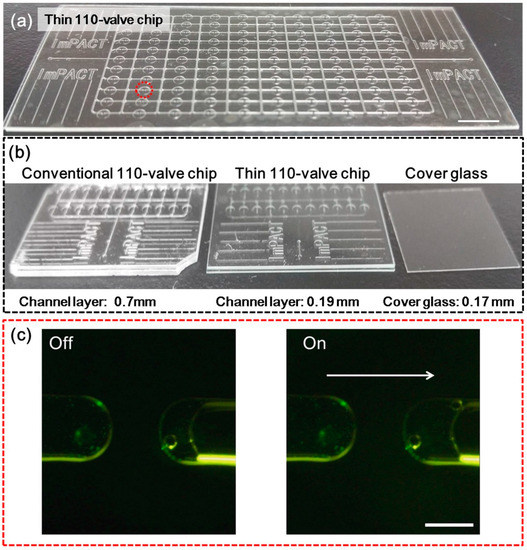 In applications such as sorting of small cells, bacteria and proteins, observation and imaging identification using a high magnitude objective lens with a high numerical aperture (NA) and a working distance of less than 0.19 mm [52] is required. Conventional methods to achieve the above applications in a static environment or a low through-put case used a hybrid structure such as the PDMS-cover glass [52,53] or PDMS-polymer-cover glass [54]. However, as mentioned in the Introduction section, PDMS has a lower fracture toughness and bonding strength than glass, which makes PDMS unsuitable for thin fluidic devices such as valve devices. On the other hand, glass qualifies for the above uses. Here we fabricated a thin glass valve chip (Figure 10a) (total thickness was 0.59 mm, channel layer for observation was 0.19 mm thick) which is impossible to make with PDMS. Figure 10b shows a conventional 110-valve chip (thickness: 1.1 mm), a thin version of the valve chip (thickness: 0.59 mm), and a cover glass (thickness: 0.17 mm). The function of the thin version all-glass valve chip was confirmed.