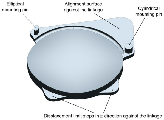 y position of the lens part in the plane, while the second pin with an elliptical shape defines the remaining rotational degree of freedom. This way positional tolerances between the cylindrical holes in the silicon amplification linkage and the injection molded pins of the lens parts can be compensated.