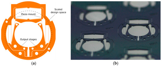 i.e., a stroke of about 140 µm per lens part), a displacement amplification ratio of at least 48.1 is required. For reasons of miniaturization and reduction of assembly processes, a monolithic design with flexure hinges was selected. The planarity of the linkage enables a Deep Reactive Ion Etching (DRIE) process for fabrication of the linkage in single-crystal silicon [