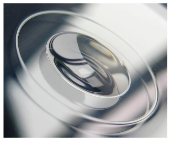 12]. For analysis and evaluation of different optical principles for the adjustment of refraction power, an axially moveable optics as well as a laterally moveable optics can be mounted in the housing. The optics integrated in the housing are designed for use of an axially moveable lens. To be able to analyze and evaluate laterally moveable optics with only one housing design, an inset lens is used to provide the necessary basic refraction power. The inset lens is fixed by an index-matched adhesive to the optics integrated in the rear window of the housing. The rear surface curvature matches the curvature of the optics integrated. The mechanical interface for mounting the different types of optics into the housing has been designed to allow for that modularity. The reference for positioning of the optical subsystem is the rear wall of the glass housing. Both types of optical subsystems are mounted to this surface by means of an ultraprecision milled mount.