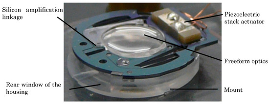 Assembly of the freeform optics, the piezo stack actuator, and the silicon linkage yields the optical micromachine.