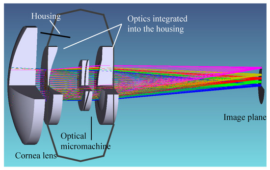 Figure 9 shows the optical model of the subsystem with some calculated rays in the case of four fields spanning half of the field angle of the foveal view of the human eye and a sketch of the housing. The optical model consists of the optical subsystem as defined above and an additional lens representing the cornea of the human eye.