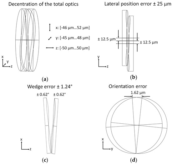 The lateral position error means a relative displacement of both lens parts perpendicular to the functional shifting direction. This is caused by assembly tolerances between lens parts and linkage as well as by manufacturing tolerances of the lens parts and is estimated to be in the range of −25 µm–+25 µm. The wedge error is caused by a relative rotation of both lens parts around an axis perpendicular to the optical axis and the shift axis, due to assembly tolerances between lens parts and linkage and is estimated to be in the range of −1.24°–+1.24°.