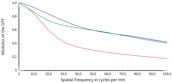Figure 11 shows the MTF of the nominal (error-free) configuration for three different adjustments of refraction power, in particular −0.8 dpt (far vision, shown in red), 1.5 dpt (intermediate vision, shown in blue), and 3.0 dpt (near vision, shown in green). The MTF was evaluated up to a limit of 100 cycl./mm. Noticeable is the decrease of the MTF in case of the far vision adjustment. This is due to the hyperopic design of the optics to be able to adapt the refraction power range of the optics to the patient’s demand after implantation.