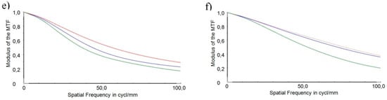 Figure 12e), leads to a steep decrease of the MTF curve in the lower frequency range below 10 cycl./mm. Above 10 cycl./mm, the slope of the decrease is only small and results in an MTF value of 0.2 at a spatial frequency of 100 cycl./mm.