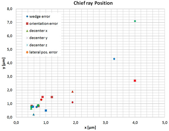 Figure 12a–c) with the reference does not reveal any relevant impact of this position error on the imaging quality of the optical subsystem. Hence, it may be concluded that the optical subsystem is robust with respect to a decentration of the complete optics in the specified range.