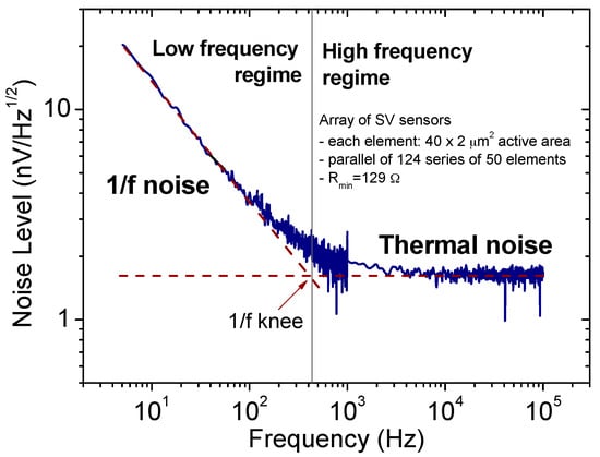 The 1/f noise, composed of an electronic and magnetic component, has a spectral density inversely proportional to the frequency, being the dominant source in the low-frequency regime [20,27]. The electronic part (1/f electronic) arises from voltage fluctuations related to charge trapping in crystal defects. The oscillations in the sensing layer magnetization caused by domain wall pinning and depinning at defect sites is behind the origin of the magnetic part (1/f magnetic) [22]. Therefore, the maximum density of 1/f magnetic noise occurs in the linear transition of the sensor, where the magnetization of the sensing layer is switching between the two saturation states. The 1/f magnetic noise is dominant in the sensor linear range and is mostly suppressed in the saturation states [29]. The 1/f spectral density is empirically described by the Hooge formulation [30]: