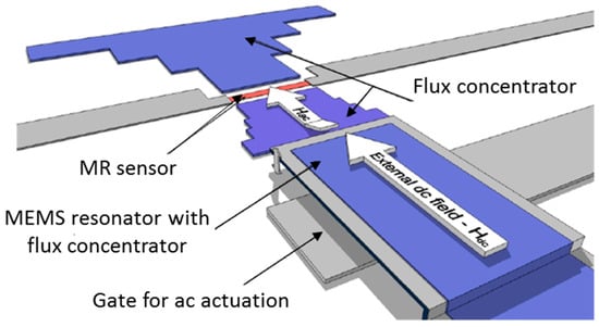 The combination of robustness and high sensitivity of MR sensors with the low power consumption and high frequency operation of MEMS resonators results in high frequency magnetic field modulation, deflection detection of micro-bridges [53], and 1/f noise suppression in SVs and MTJs. Microelectromechanical flux concentrator, where MFCs are defined on MEMS flaps can then be integrated with MR sensors. The novelty of this device relies on the mechanical modulation of (quasi-)DC fields at the sensor position achieved by the MFCs oscillation at a frequency corresponding to the MEMS resonance, allowing a shift in the operating point to the high-frequency range [40,41,54,55,56,57,58,59,60]. A schematic is shown in Figure 3.
