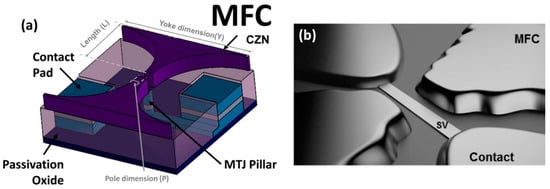 Figure 4. (a) Schematic view of MFCs with funnel shape geometry and respective integration with a patterned MTJ sensor (before the top contact deposition). Reprinted with kind permission of The European Physical Journal (EPJ); (b) Illustration of steep profile MFCs close to a SV single sensor. Reprinted with permission from Leitao D.C. et al., Sensors 2015, 15, 30311–30318. Copyright 2015 MDPI.