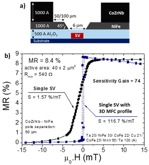 Figure 5. (a) Schematic cross section of the double layer MFC with a 3D tapered profile, showing a pole angle of 45° in the NiFe film and a steep profile in the CoZrNb pole, integrated with a SV sensor; (b) Effect of the 3D tapered profile MFC integration on the magnetotransport curve of a single SV sensor, showing a sensitivity enhancement of 74 times.