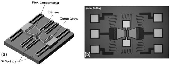 Figure 6. (a) Schematic view and (b) SEM image of the proposed MEMS flux concentrator device. Reprinted with permission from Edelstein A.S. et al., J. Appl. Phys. 2006, 99, 08B317. Copyright 2006 AIP Publishing LLC.