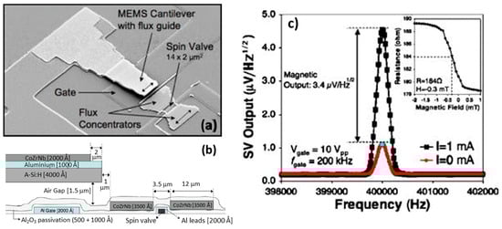 Figure 7. (a) SEM image of the hybrid device showing the integration of a SV sensor with static MFCs and a single MEMS cantilever resonator (with an additional MFC on top); (b) Schematic view of the device cross section; (c) SV voltage output exhibiting both electric (capacitive coupling) and magnetic components when the cantilever resonates at a frequency of 200 kHz. Reprinted with permission from Guedes A. et al., J. Appl. Phys. 2008, 103, 07B924. Copyright 2008 AIP Publishing LLC.