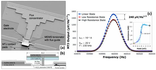 57. Guedes, A.; Patil, S.; Wisniowski, P.; Chu, V.; Conde, J.P.; Freitas, P.P. Hybrid Magnetic Tunnel Junction-MEMS High Frequency Field Modulator for 1/f Noise Suppression. IEEE Trans. Magn. 2008, 44, 2554–2557. [Google Scholar] [CrossRef]