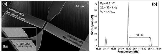 Figure 9. (a) SEM image of the developed device, showing the SV sensing element between two resonator cantilevers with integrated MFCs; (b) Acquired data resulting from the modulation of a low-frequency AC field (0.3 mT with a frequency of 30 Hz), exhibiting the respective sidebands when the cantilevers are actuated at the resonance frequency (f0 = 17.7 kHz). Reproduced with permission from Guedes A. et al., IEEE Trans. Magn. 2012, 48, 4115; published by IEEE, 2012.