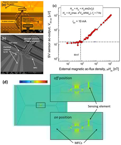 Figure 11. (a) Optical and (b) SEM image of modulator combining in-plane electrostatic microactuators with interdigitated fingers comb drive, SV sensors and MFCs; (c) Modulated sensor output as a function of magnetic field amplitude at low frequency (7 Hz); (d) Finite element simulation which illustrates the concentrated magnetic flux in the sensing element for the two positions: off-minimum concentration; on-maximum concentration.