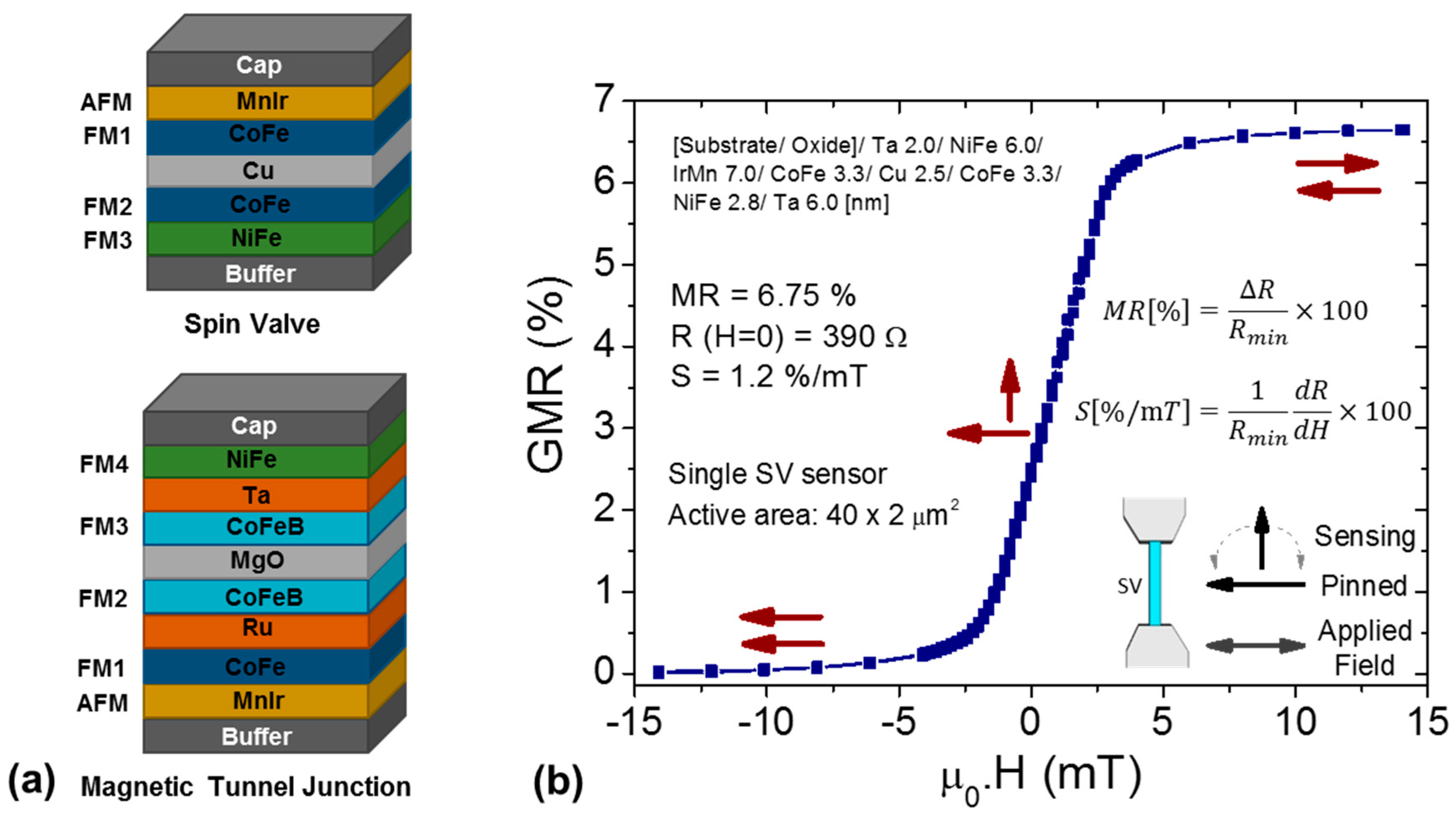 Figure 1. (a) Schematic view of a typical multilayer for spin-valves (SV) and magnetic tunnel junction (MTJ) sensors. SV: antiferromagnet (AFM), pinned layer (FM1), conductive spacer (Cu), sensing layer (FM2 and FM3). MTJ: antiferromagnet (AFM), pinned layer (FM1), insulator spacer (MgO), sensing layer (FM3 and FM4); a synthetic antiferromagnet (SAF) is obtained with the tri-layer FM1/Ru/FM2. The pinned layer magnetization is set in a fixed direction due to exchange-bias at AFM/FM interface; (b) Representative magnetotransport curve obtained for a patterned SV sensor (active area: 40 × 2 µm2) exhibiting a linear, centered and hysteresis free response. Red arrows illustrate the relative orientation of the in-plane magnetization in both pinned and sensing layers. S stands for the sensor sensitivity.