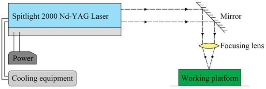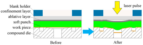 Figure 1 shows the laser machining equipment schematically. It consists of power, cooling equipment, a Spitlight 2000 Nd-YAG laser, a mirror, a focusing lens and a working platform. The laser device first irradiates the pulse laser horizontally and then the horizontal laser beam is reflected by a mirror. The mirror is placed at a 45° angle, so the optical path will move downward vertically into the working platform. Figure 2 presents detailed information about the working platform and the laser compound process. The working platform consists of a blanking holder, a confinement layer, an ablative layer, a soft punch, thin sheet metal and a compound die. First, the laser pulse penetrates through the confinement layer. Then laser pulse irradiates on the ablative layer and it vaporizes instantaneously. The vapor absorbs the remaining laser energy and gets ionized into high-temperature and high-pressure plasma [19,20]. The plasma expands quickly and is bounced back by the confinement layer above, thus generating a strong laser shockwave. Under the constraint of the confinement layer and the blanking holder, plasma can only move downward into the soft punch. Under the action of the soft punch and compound die, work pieces are shaped into micro-parts because soft punches are hyper-elastic and incompressible. To conclude, the blanking holder is used to confine the material outside the die cavity. The confinement layer is used to hinder plasmas from expanding upward to magnify the peak pressure and prolong the duration time shockwave pressure. The ablative layer consists of black paint pre-coated on the one side of the silica gel before experiments and it can protect the soft punch from being directly irradiated by the laser pulse and enhance the absorption rate of the laser energy [21]. When one experiment was done, it was necessary to use a new soft punch with an ablative layer because the ablative layer was absorbed by laser beam. The function of the soft punches is to transfer laser energy into mechanical energy acting on the surface of the work piece.