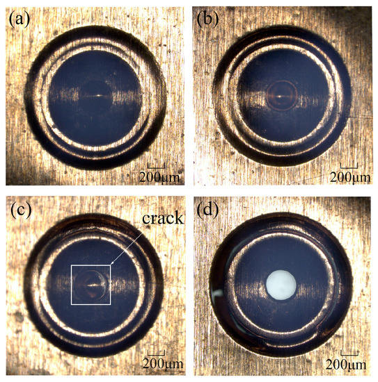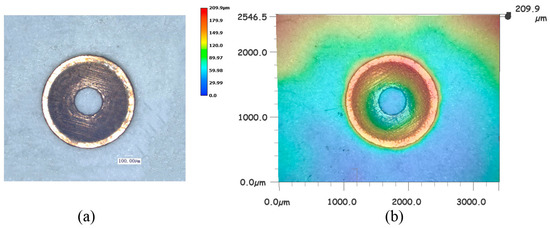 Laser energy is one of the key parameters in the process of laser machining, especially in this experiment, and it will affect the morphology of the work piece under different laser energies. Laser energy is not supposed to be too low. If the laser energy is too low, it cannot generate enough laser shock wave pressure to complete the three processes of micro drawing, punching and blanking, and that means it can only achieve partial processes. In order to investigate the effect of laser energy on the compound process, a series of experiments were carried out on the copper foil using the soft punch of 200 μm thickness under different laser energy. The morphology of the work piece was observed by a KEYENCE VHX-1000C digital microscope (by KEYENCE Corporation in Osaka, Japan). As shown in Figure 4a, the process of deep drawing appeared but the hole was not completely punched when the laser energy was 565 mJ. In this period of time, only elastic and plastic deformation happened within the material. Compared with Figure 4a, Figure 4b shows that the deformation of the work piece around the punching hole area became more obvious and severe when more laser energy, 675 mJ, was acted on the material. Furthermore, a crack began to appear when the laser energy was 835 mJ as shown in Figure 4c. Moreover, the punching process finished but the blanking process did not finish under the laser energy of 1200 mJ as shown in Figure 4d. It can be seen that although the inner diameter of the blanking area had almost been cut off from the work piece, a few cracks appeared around the outer diameter of the blanking area. This can be explained by the uneven distribution of the laser energy in space, which means the laser energy in the central area is higher than that in the surrounding area. From this aspect, it is understandable why the punching of the central hole was finished before the blanking of the micro-parts. In addition, the reason why the micro-part cannot be separated from the work piece is because the laser energy is not big enough and the maximum shear stress suffered at the edge of the blanking mold is still less than the dynamic fracture strength of the material itself. Finally, the dish-shaped micro-part was blanked out when the laser energy reached 1550 mJ and Figure 5 shows the positive side of the blanked micro-part. Figure 5a shows the 2D plot of the work piece and Figure 5b shows the three-dimensional (3D) plot. It can be found that the quality of the work piece is fine under the laser indirect shocking compound process. From Figure 4 and Figure 5, it can be seen that the compound process has sequences, namely forming, piercing and blanking with the increase of the laser energy. In traditional methods, the sequence is very important for fabricating this kind of part. For example, if the piercing process is finished first, it could cause some problems because it becomes difficult to ensure the hole’s dimensions when undergoing the forming process. So, the sequence, forming, piercing and blanking can somehow ensure the accuracy.