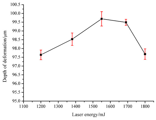 Although Figure 4 and Figure 5 show the morphology of both work pieces and micro-parts qualitatively, it is still necessary to study the depth of deformation quantitatively because it is an important index by which to evaluate the quality of the part. So, in order to specifically investigate the effect of the laser energy on the compound process, the deformation depth of deep drawing should be considered. In the experiment, laser energies of 1200, 1380, 1550, 1690 and 1800 mJ were used, respectively, when the thickness of the soft punch was 200 μm and that of the work piece was 40 μm. Figure 6 shows the relationship between the laser energy and deformation depth when the thickness of the soft punches was 200 μm. Three experiments were carried out under each laser energy. It can be found that the maximum deformation depth of the work pieces was 99.69 μm (E = 1550 mJ) while the deep drawing depth of the compound die was 105 μm. One explanation is that air was enclosed in the compound die cavity and it was compressed gradually during the laser compound process, which led to the resistance force becoming stronger. If the laser energy was too high and the air could not be expelled out, it would prohibit the material flow [23]. So, the deformation depth cannot reach 105 μm. This figure also shows that the deformation depth increased from 97.64 to 99.69 μm with the laser energy when the laser energy was not greater than 1550 mJ. It is mainly because a higher laser energy makes the ablative layer absorb the laser energy more efficiently and more plasmas are generated [19]. When the laser energy increases, more black paint can be vaporized because of the high laser energy. In this case, stronger plasma can be generated. So, generally speaking, it can be seen as a linear process. This means the shock wave pressure produced by the expansion of the plasmas becomes more powerful and larger plastic deformation of the material is achieved in the compound process. In this case, more material could flow into the cavity of the die and the micro-part could attach the rigid mold more closely, so it could increase the depth of deformation. However, it does not mean that more laser energy will lead to better results. When the laser energy is too high, it may lead to a serious thermal effect on the sample [19]. Another issue is that the depth of the deformation decreased when the laser energy was higher than 1550 mJ. It was seen that when the laser energy was 1800 mJ, the deformation depth showed a sharp decrease from 99.49 to 97.68 μm. This can be explained by the fact that when the laser energy is too high, the work piece collides with the compound die fiercely and then generates rebound forces, causing springback of the micro-parts. Therefore, the depth of deformation decreased. Kolleck et al. [4] researched the combined micro-forming and punching process and also found the springback behavior of the work piece during the opening stage because of the residual stress on the foil following the punch’s retreat. They also found that when the chamfer angle of the modified blanking die increases, the springback becomes more obvious. Therefore, compared with the single punching process, the combination of punching and forming makes the springback become more severe. The springback is not good for the forming, so it is necessary to choose a proper laser energy to reduce the springback. It can be concluded that the laser energy should be neither too low nor too high and the best laser energy for the maximum deformation depth, 99.69 μm, was at 1550 mJ.