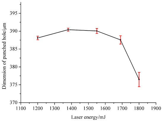 The punched hole is rather important for the dish-shaped micro-part because this hole can be used to connect with the shaft. In order to study the dimensional accuracy of punched holes, the diameter of the hole was measured under different laser energies. Figure 7 shows the relationship between the laser energy and the dimension of the punched hole and the error bar is the standard deviation. The maximum diameter of the hole was 390.41 μm when the laser energy was 1380 mJ. If the laser energy was 1200 mJ, the diameter was 388.11 μm, lower than that at 1380 mJ. However, when the laser energy was beyond 1380 mJ, the diameter of the hole decreased gradually from 390.41 to 376.48 μm. This indicates that in order to obtain precise micro-parts, a reasonable laser energy should be used and it cannot be too low or too high. It can be seen that when the laser energy reached 1800 mJ, the standard deviation of the diameter value was rather big. It means that higher laser energy may make the diameter value of the micro-parts more unstable. The reason may be that when excessive laser energy was employed, the micro-part stuck to the mold and it was difficult to take it out from the mold, so the dimensional accuracy of the punched hole was poor. On the contrary, when the laser energy was 1380 mJ, the standard deviation of the value was relatively smaller and this means its value was more accurate and stable. So the best laser energy for punching the hole was 1380 mJ and the dimensional accuracy of the hole at 1550 mJ was very close to this value.