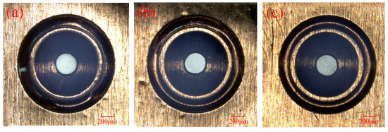 Soft punches play important roles in the laser compound process. As the silica gel is hyper-elastic, it is generally assumed to be nearly incompressible during deformation. In traditional methods, an injection device is needed to push parts off the mold and it may make the mold more complicated, especially when the scale of the parts is small. However, the soft punch using silica gel has an adhesive force on the micro-parts and it can stick with the micro-parts, so the micro-part is easier to separate from the compound die. Soft punches can prevent the laser from directly contacting the work piece, so surface quality can be ensured without tool marks [13]. In this study, soft punches with different thicknesses were employed, at 200, 300, 400 μm, respectively. If the thickness of the soft punches is less than 180 μm, the surface quality is poor [16]. In addition, the use of the soft punch can smooth the laser energy deposition [24]. If the soft punch’s thickness is too thin, its ability to homogenize the laser energy is weak and this may cause the work piece to be subjected to non-uniform pressure. That can affect the dimensional accuracy of micro-parts. So, in this case, a thickness under 200 was not employed in the experiment.