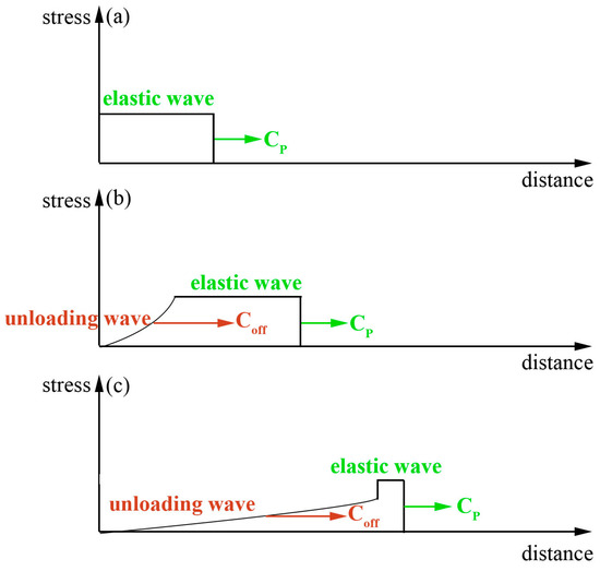 Schematic propagation of elastic waves: Cp is the velocity of the elastic wave; Coff is the velocity of the unloading wave. (a) Only elastic wave; (b) unloading wave occurs; (c) the elastic wave is almost be caught up by unloading wave.