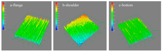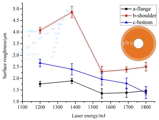 As shown in Table 3, the surface roughness under different laser energies was measured on three areas, namely the (a) flange, (b) shoulder and (c) bottom. The arithmetical mean deviation (Ra) was used to evaluate the roughness value. Figure 10 shows the relationship between the laser energy and the surface roughness values on three different areas. The surface roughness of three manufactured micro-parts was evaluated under each laser energy. It can be found from Figure 10 that the surface roughness value plunged on the flange and shoulder area when the laser energy reached 1550 mJ. The explanation may be that when the laser energy reached 1550 mJ, the micro-part separated from the work piece completely and, in this case, the micro-part was not restricted by the blank holder anymore. The constraint of the material was reduced and then the contact with the mold became smaller, thus making the surface roughness drop quickly. So, the blanking process has an effect on the surface roughness. In other situations when the laser energy increased from 1200 to 1380 mJ and 1550 to 1800 mJ, the surface roughness value increased with the laser energy. This is because in this experiment, the surface of the deep drawing mold was not grinded and polished in order to ensure its dimensional accuracy, so its surface is a little rough and may cause friction between the material and die. As the laser energy became higher, more plasma was induced and higher laser shock pressure was generated to act on the work piece, leading to a stronger plastic deformation conformal to the underlying three-dimensional rigid mold. Hence, the work piece was more likely to duplicate the features of the mold. However, the bottom area saw a very different trend. As shown in Figure 10, the surface roughness value decreased with the laser energy. This is mainly because the successive laser impact perpendicular to the grinding direction can decrease the peak height of the surface profile induced by grinding [26]. In addition, as the position was closer to the shocked region, the surface quality can be improved [27], which means the surface roughness value decreased. The springback also contributed to the decrease of the surface roughness value. The combined process of forming and punching makes the springback become more obvious as mentioned in Section 3.1. When the springback happened, it could also lead to the decrease of the surface roughness value on the (c) bottom area. So, the combination of forming and punching also has an effect on the surface roughness.