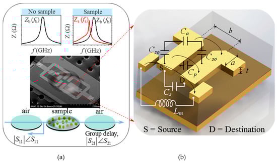 Microwave characterization principle and modeling of sensing region. (a) Scanning electron microscope (SEM) image of the fabricated biochip illustrating its sample characterization principle in a microwave regime based on S-parameters, derived parameters, and characteristic impedance self-resonance spectroscopy; (b) Equivalent circuit modeling of the sensing region in terms of its sample-dependent coupling capacitance and mutual inductance.