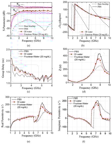 The measured return loss (S11) and insertion loss (S21) of the bare biochip and the biochip bearing deionized water, the phosphate-buffered saline (PBS) solution, and the fructose–water solution—which are plotted against a frequency range of 0.1–10 GHz in Figure 3a—indicate a significant increase and decrease in the reflected and transmitted energy of the bare biochip relative to the biochip consisting of the sample. Additionally, maximum and minimum transmitted energies are observed for the PBS and fructose–water solution, respectively. It should be noted that the PBS solution is the most viscous material among the tested materials [17]. However, the fructose–water solution exhibits the lowest viscosity [18] among them because the addition of fructose in water lowers its viscosity. Therefore, the physical properties (viscosities) of the tested solutions exhibit a manifest and informative correlation with the reflected and transmitted energies of the biochip. The phase of S11, which is shown in Figure 3b for the above conditions, indicates that the frequency corresponding to the 180° phase of the biochip bearing the sample is shifted upward. This upward frequency shift is the highest and lowest for the PBS solution and fructose–water solution, respectively.