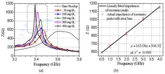 To detect the levels of glucose based on impedance spectroscopy, the characteristic impedances of the biosensor with glucose samples of varying concentrations were calculated from the measured S-parameters using Equation (6). The calculated impedances, which are plotted against frequency in Figure 4b, indicate a marked positive correlation between the impedance and glucose level for an approximate frequency range of 3–3.7 GHz. In addition, the impedances exhibit glucose level-dependent resonance peaks, whose variations in impedance are more sensitive than those of any other points. The impedance of the resonance peaks with the minimum and maximum glucose concentrations of 100 and 200 mg/dL are 295 and 503 Ω, respectively. For other glucose samples, the peak impedance is maximized when the concentration of glucose in the serum is maximized. The solid line in Figure 4c, plotted using a least square regression method, represents a linear fit (r2 = 0.9954; r is the coefficient of correlation) of the glucose concentration (x) with the variations in the impedance of peaks (y) using the following equation: