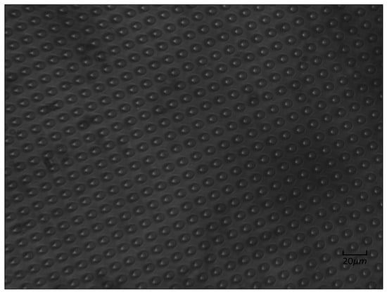 PDMS was prepared using a Sylgard 184 (Dow Corning Corp., Midland, MI, USA), and a curing agent was made in a ratio of 12:1 w/w. The mixture was placed in a desiccator and degassed for 20 min and then poured into a Petri dish and degassed in a vacuum heating furnace at 70 °C for 12 h. A scalpel was used to evenly cut around the pattern, and the PDMS was removed from the silicon mold. Figure 1 depicts the optical microscope image of PDMS.