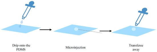 We tested the fixed performance of the PDMS. Zebrafish embryo cells have different features that are elastic and require different puncture forces for each developmental stage. So, the 32-cell-stage was selected for the microinjection. PDMS was placed in a culture dish submerged in deionized water 5 mm below the water surface. This was to exclude the interference of fluid and surface tension. A zebrafish embryonic cell mixture was pulled into a microsuction tube and then dripped on the PDMS. After the cell fell on the PDMS surface, the culture dish was then moved to the microscope (AE31, Motic, Xiamen, China) platform to microinject the targeted embryos. To detect the force of the injection, a force sensor (Nano17, ATI, Apex, NC, USA) was applied between it and the motor. A three-degrees-of-freedom (3-DOF) robotic arm with a 0.04 μm positioning resolution (model: MP-285, Sutter Inc., Novato, CA, USA) drives the injection needle to puncture the cell, and cell injection success or failure was recorded. The experimental injection system appears in Figure 2. The whole procedure is shown in Figure 3; the cell was dripped onto the PDMS surface for the microinjection and transferred away by a suction tube.