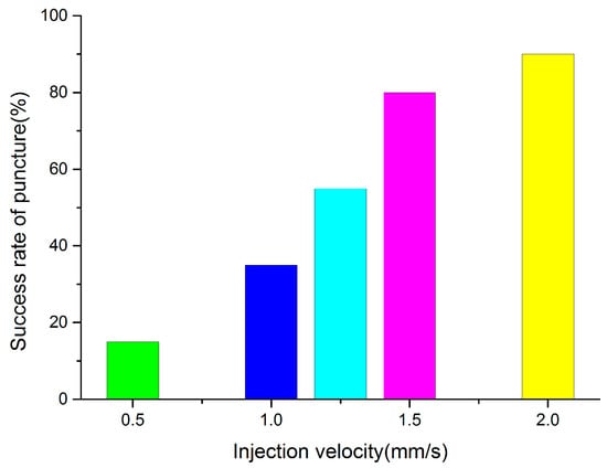 Different injection velocities were tested 20 times. Video S1 shows the robot-assisted microinjection experiment with the zebrafish embryo at 1.5 mm/s. From Figure 4, we can find that the success rate of puncture obviously rises as the injection speed increases. This was the result of the increasing acceleration between the embryo and the needle, as well as the interaction force. Injection success was low when the velocity was less than 1 mm/s, and reached 80% at 1.5 mm/s, which meets the application standard of microinjection. A velocity faster than 1.5 mm/s is feasible, so this method has broad application for automated microinjection processes.