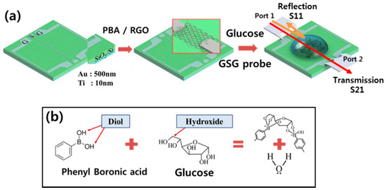 For planting PBA on the RGO surface, 4-phenylbutyric acid (C6H5(CH2)3COOH, Sigma Aldrich, St. Louis, MO, USA) and 3-aminophenylboronic acid (C6H8BNO2, Sigma Aldrich, St. Louis, MO, USA) were dissolved in N,N-dimethylmethanamide (C3H7NO, DMF, Sigma Aldrich, St. Louis, MO, USA), and then N-(3-Dimethylaminopropyl)-N’-ethylcarbodiimide hydrochloride (C8H17N3·HCl, EDAC, Sigma Aldrich, St. Louis, MO, USA) was continuously added. We dropped this solution (10 μL) onto the RGO surface in the sensing device, and kept it for 2 h at room temperature. The functional groups of RGO assisted in attaching PBA on it with chemical interactions. After that, it was rinsed twice with pure DMF and distilled water to remove the reagents. Then, using a sensor device with PBA on RGO (PBA/RGO), we measured the S-parameter, which is the ratio of output to input signal between connected ports, by GSG probe with network analyzer (E5071C, Agilent, Santa Clara, CA, USA) after dropping glucose solution on the device surface. The network analyzer generated the microwave signal and detected the returning signal from the sensor device with GSG pattern. As shown in Figure 1a, the reflected S-parameter (S11) was obtained from port 1 to 1 again, and the transmitted S-parameter (S21) was from port 1 to 2. By the interaction between PBA and glucose molecule described in Figure 1b, glucose molecules were caught on the PBA/RGO interconnector.