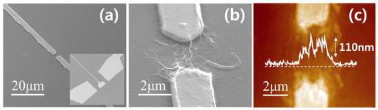 Figure 2a,b present SEM images of stretched two signal lines and GSG electrode pattern. A PBA/RGO interconnector connected between two signal electrodes and PBA built up the entangled structure on the RGO sheet. The thickness of the PBA/RGO interconnector was 110 nm, as described in Figure 2c.